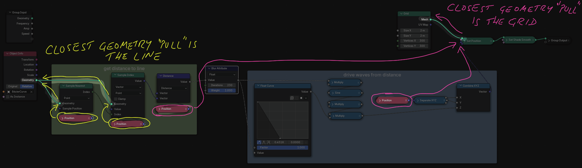To do the wave animation, I did the same input -> mult -> sine -> mult -> position thing as in a few prior examples but got tired of the messy stacked nodes, so introduced a new concept here, Group