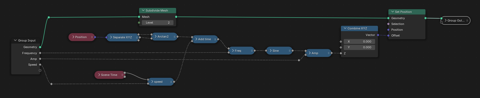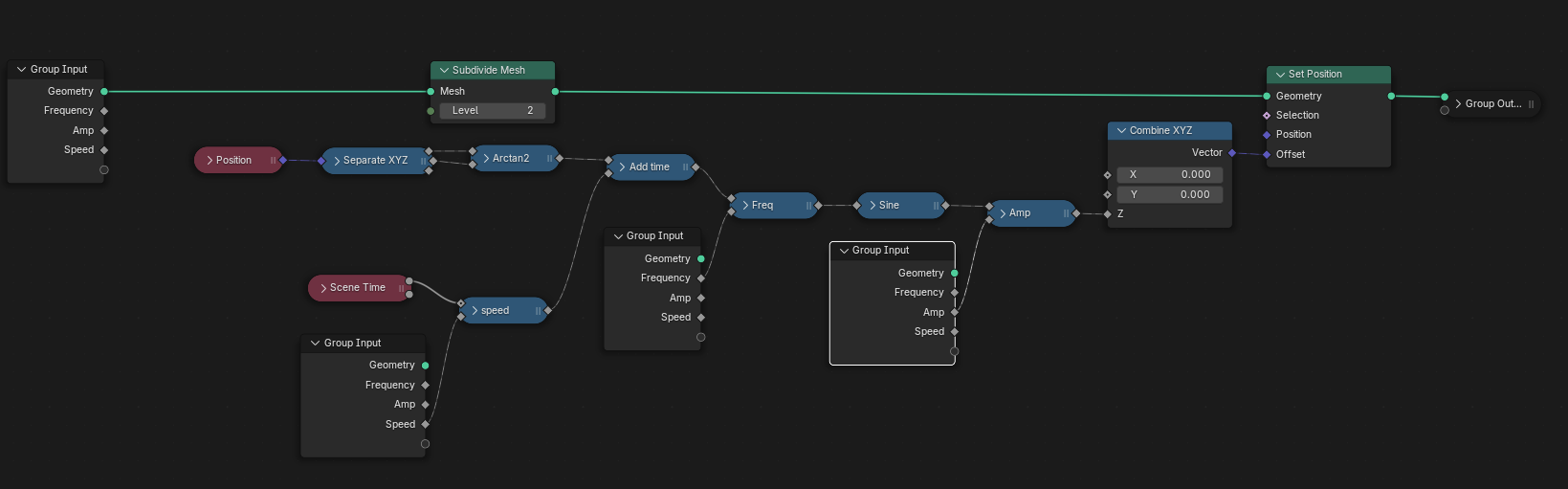 To do the wave animation, I did the same input -> mult -> sine -> mult -> position thing as in a few prior examples but got tired of the messy stacked nodes, so introduced a new concept here, Group